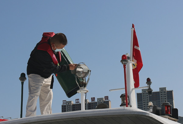 航标員進行航标維護保養,清潔航标,為過往船舶提供更好的指引服務。